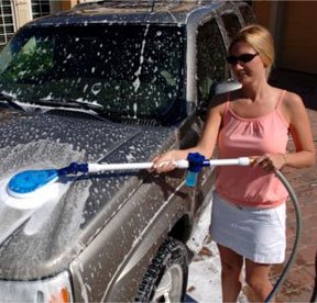 WhirlyWash is a revolutionary water-powered, gear-driven soft bristle brush that attaches to any garden hose for washing cars, trucks, RV's, SUV's, boats, windows, siding and much more! The 5" rotating inner brush does the scrubbing for you while the 8" outer brush prevents splashing. The 11-way adjustable brush head makes it ideal for cleaning hard to reach places - extends to 57" when fully assembled. The bristles are made of super-soft nylon and are safe to use on even the finest vehicle finish.